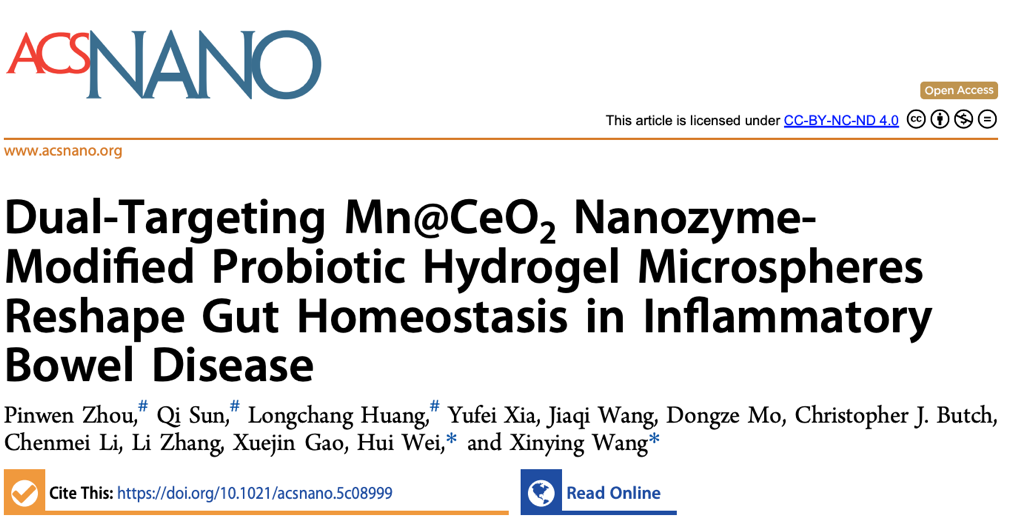 2025825日,娱乐平台-十大博彩娱乐平台 附属金陵医院王新颖教授团队与南京大学现代工程与应用科学娱乐平台 魏辉教授团队合作,在《ACS Nano》在线发表了题为“Dual-Targeting Mn@CeO2 NanozymeModified Probiotic Hydrogel Microspheres Reshape Gut Homeostasis in Inflammatory Bowel Disease”的研究成果。该研究创新性构建的MnCe@LR/AMs递送系统,为炎症性肠病提供了全新的精准化、协同化治疗策略,有望推动 IBD 治疗从“单一干预”向“多维度协同”升级。该项研究得到了国家自然科学基金委、科技部、江苏省科技厅以及中央高校等基金的支持,并在相关研究方面得到合作实验室的大力协助与支持。