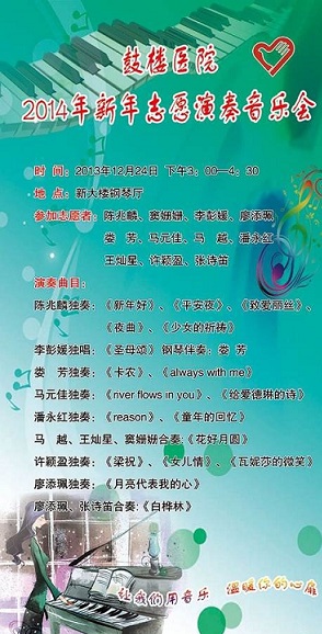 鼓楼医院钢琴志愿演奏服务队成立于2012年11月,一年来,志愿者用自己的爱心和美妙的音乐温暖着患者的心扉。在圣诞节和元旦即将来临之际,志愿者们决定用音乐向大家致以节日的祝福。