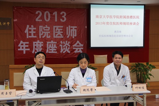 座谈会由教育处周卫红副处长主持,她首先代表教育处致欢迎词。接着周玉皆处长介绍了我院2013年度住院医生规范化培训工作,2013年我院承担并顺利完成了江苏省住院医师规范化培训南京地区内科、麻醉科、病理科、神经内科的临床技能考核工作,我院细致完备的前期准备使得考核紧张有序地开展,得到了省卫生厅、市卫生局领导的高度肯定;2013年度共有86名住院医师参加教育处组织的年度考核;85人顺利通过省卫生厅组织的各项考核,完成第一阶段住院医师规范化培训,23人完成第二阶段住院医师规范化培训;28名2010级规培医师完成结业述职,经过考核汇总以及双向选择,26名医生顺利留在我院工作;2013年7月我院迎来新一批规培医师,目前我院在培一阶段医师183人;二阶段99人;接受外院委培医师18人。