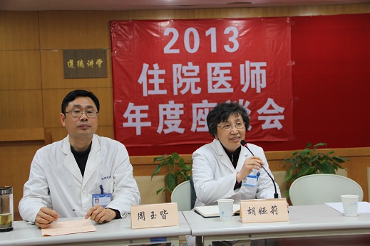 2014年1月10日下午3点在1号楼2201会议室举行了2013年度住院医师年度座谈会,胡娅莉副院长、医务处叶树俊处长、人事处魏远馨副处长、在培住院医师、全科医师以及各科住院医师辅导员近250人应邀出席。
