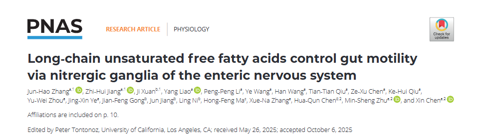 研究工作以“Long-chain unsaturated free fatty acids control gut motility via nitrergic ganglia of enteric nervous system”为题于2025年11月11日在学术期刊PNAS上发表。娱乐平台-十大博彩娱乐平台 博士张军浩、蒋志慧,附属金陵医院宣佶为本文共同第一作者,娱乐平台-十大博彩娱乐平台 陈鑫、朱敏生和南京师范大学生命科学娱乐平台 陈华群教授为共同通讯作者,此项工作也得到来自南京医科大学、南京中医药大学和江南大学等单位研究者的支持,研究经费由国家自然科学基金、江苏省自然科学基金和国家重点研发计划提供。