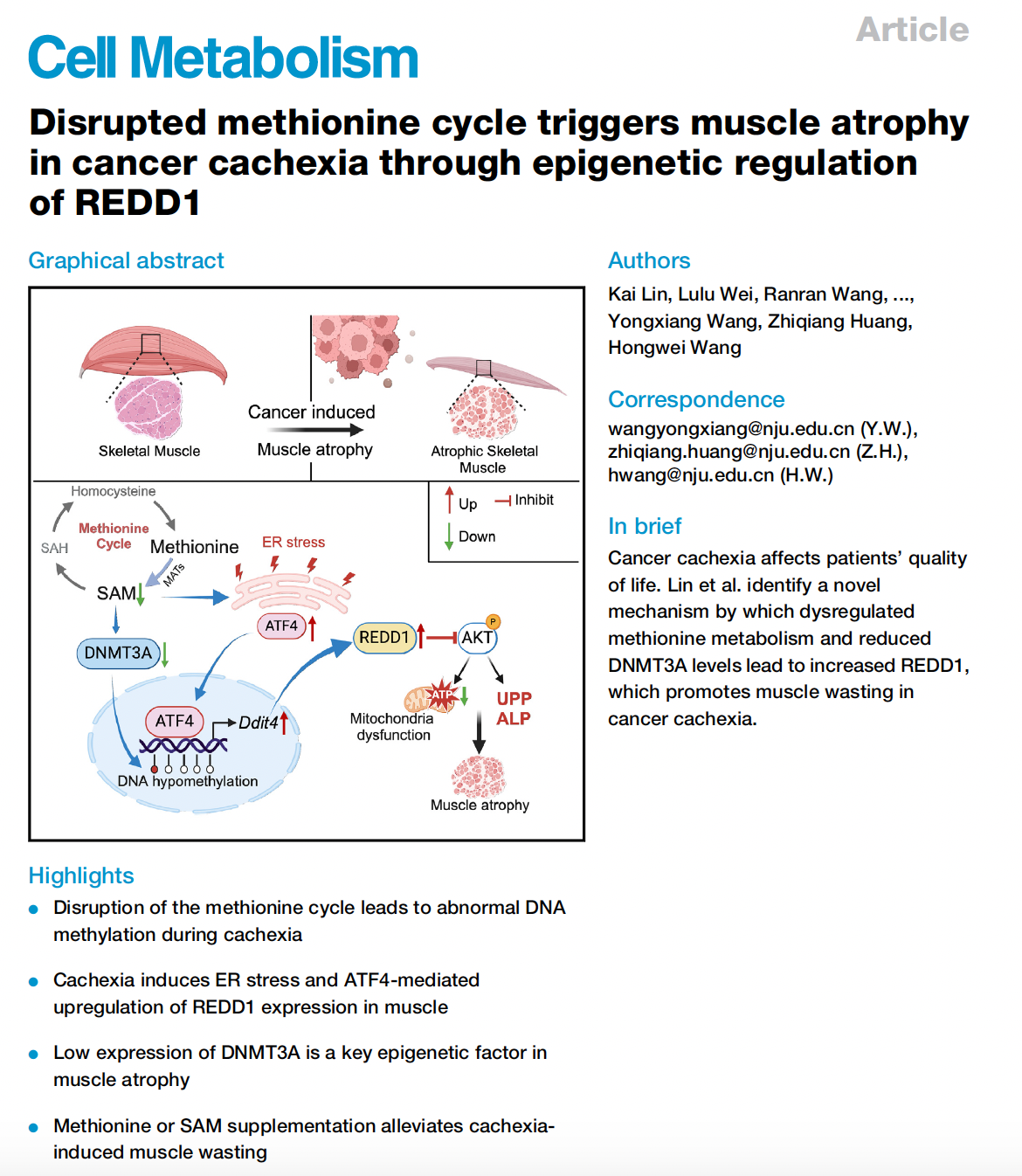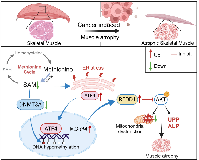 2024年12月26日,Cell Metabolism在线发表了娱乐平台-十大博彩娱乐平台 王宏伟教授、助理教授黄志强团队与苏北人民医院王永祥教授团队合作的研究论文,题为”Disrupted methionine cycle triggers muscle atrophy in cancer cachexia through epigenetic regulation of REDD1”。该研究首次报道了恶液质引起的骨骼肌萎缩的重要代谢网络,揭示了DNMT3A-ATF4-REDD1的表观调控机制,并提出恢复蛋氨酸循环和SAM补充是改善恶液质骨骼肌萎缩的潜在营养干预途径。