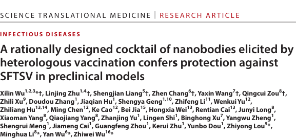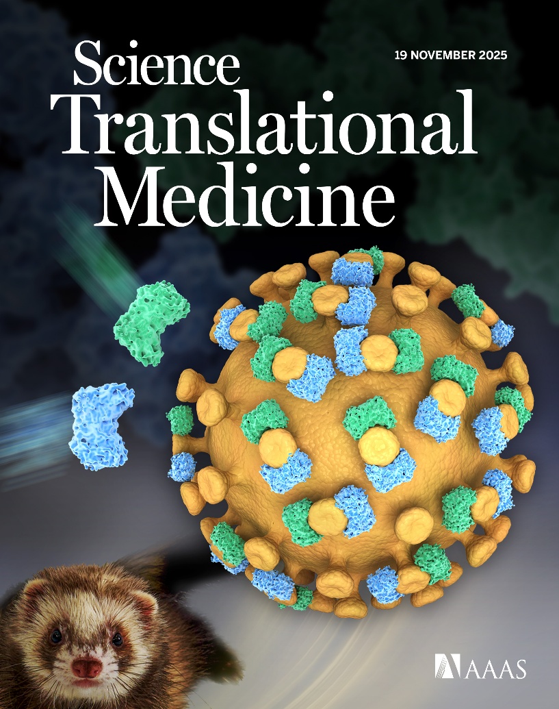 2025年 11月 19日,该研究成果以封面论文发表于《Science Translational Medicine》杂志,题目为“A rationally designed cocktail of nanobodies elicited by heterologous vaccination confers protection against SFTSV in preclinical models”。封面以 SFTSV病毒颗粒为视觉主体,艺术化呈现 Nb261与 Nb318纳米抗体协同结合 Gn蛋白的立体结构,象征“表位互补、协同防护”的核心科学理念,突显纳米抗体在精准靶向和应对多样性病毒中的独特潜力。