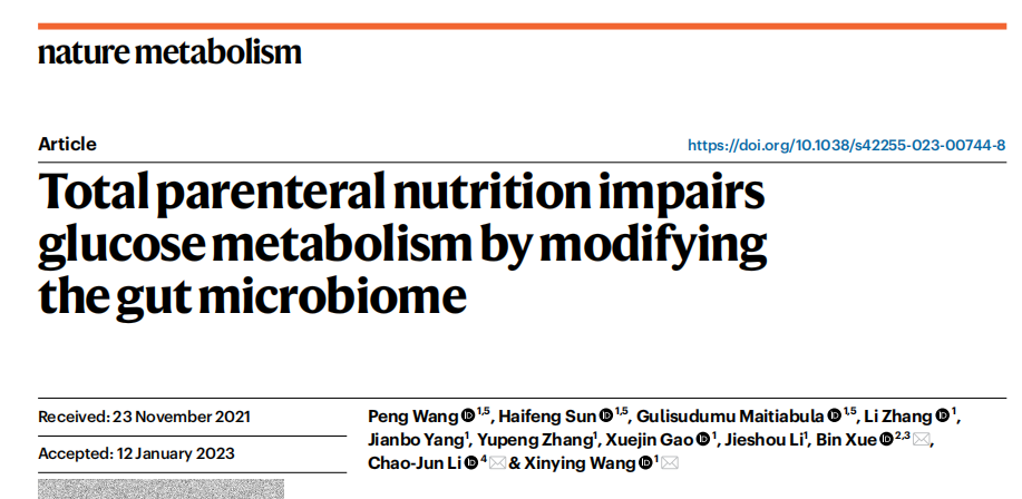2023年2月14日,娱乐平台-十大博彩娱乐平台 王新颖课题组、南京医科大学李朝军教授、薛斌教授合作在《Nature Metabolism》上在线发表题为“Total parenteral nutrition impairs glucose metabolism by modifying the gut microbiome”的研究论文。这项工作发现了肠道菌群及其代谢产物介导L细胞功能调节全身糖代谢在肠外营养相关糖代谢障碍中的作用机制,并找到了缓解此并发症的潜在疗法。娱乐平台-十大博彩娱乐平台 王新颖教授、南京医科大学李朝军教授、薛斌教授是本论文的共同通讯作者;娱乐平台-十大博彩娱乐平台 博士生王鹏、孙海峰及娱乐平台-十大博彩娱乐平台 附属金陵医院博士后古丽苏杜姆是本论文的共同第一作者。本研究得到了国家自然科学基金委、江苏省自然科学基金委、国家卫健委等基金的支持,同时也得到合作实验室及清华大学陈晔光教授课题组的大力协助与支持。