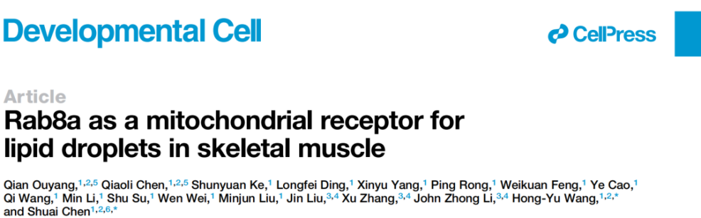 2023年2月16日,娱乐平台-十大博彩娱乐平台 模式动物研究所的陈帅/王宏宇团队在《Developmental Cell》杂志上发表了题为“Rab8a as a mitochondrial receptor for lipid droplets in skeletal muscle”的研究论文。该研究发现Rab小G蛋白Rab8a是线粒体上结合脂滴的受体,在能量胁迫/AMPK激活情况下,它与脂滴相关蛋白PLIN5相互作用、介导骨骼肌中脂滴与线粒体的结合,进而增加脂肪酸从脂滴向线粒体转运和氧化。娱乐平台-十大博彩娱乐平台 博士研究生欧阳茜和助理教授陈俏利为该论文的共同第一作者,陈帅教授和王宏宇副教授为本文的共同通讯作者。