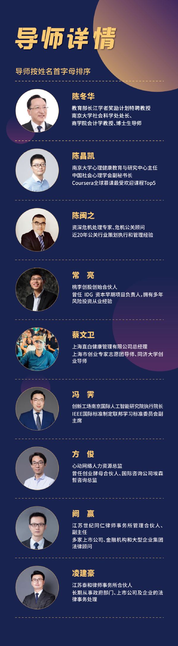 创业紫金班,作为南京大学卓越人才培育计划之“创新创业杰出人才”项目,旨在培养兼具专业知识、创业素养、实践能力和管理能力的能适应未来技术、未来产业发展的创新创业人才,以项目孵化为导向,坚持创业实践教育,通过系统性、专业化的培训课程学习及跟踪辅导相结合的模式,帮助学生建立产业化思维,打通项目落地的渠道,助推师生共创和科技成果转化。