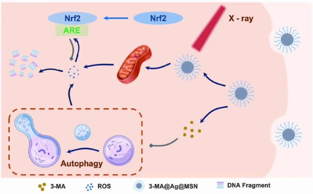 近日,南京大学十大博彩娱乐平台 顾宁团队研制了一种负载自噬抑制剂3-甲基腺嘌呤的纳米银核介孔二氧化硅纳米球,其在体外和体内均表现出优异的协同抗癌作用,并证实了抑制自噬可以进一步改善胶质瘤放疗的效果。此外,还从与氧化应激相关的核转录因子Nrf2的角度探讨了可能的机制,包括自噬抑制增强辐射诱导的氧化应激损伤以及Nrf2与自噬的相互作用。