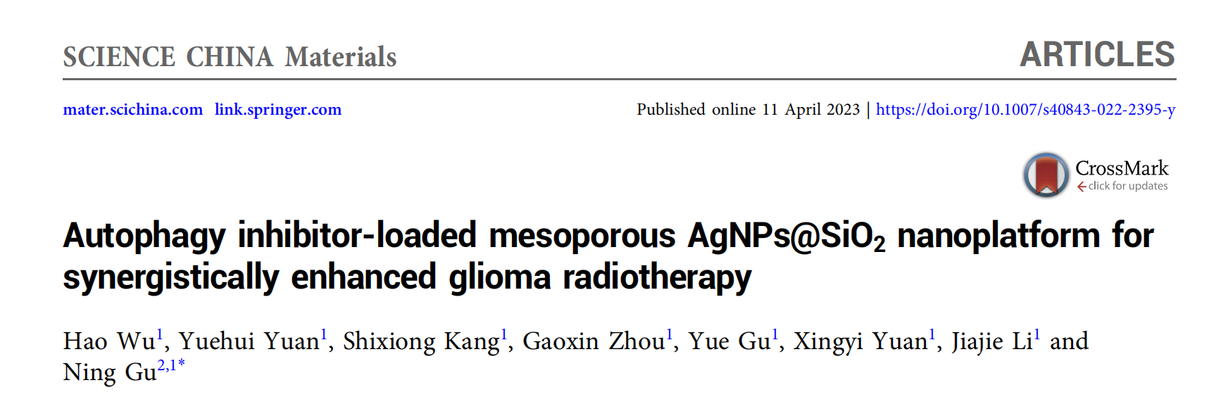 2023年4月11日,娱乐平台-十大博彩娱乐平台 顾宁教授在《Science China Materials》上在线发表题为“Autophagy inhibitor-loaded mesoporous AgNPs@SiO2 nanoplatform for synergistically enhanced glioma radiotherapy”的研究论文。这项研究为将纳米银作为与自噬抑制剂结合用于胶质瘤放射增敏提供了一个愿景,并为其临床转化提供了一种可行的策略。娱乐平台-十大博彩娱乐平台 顾宁教授是本论文的通讯作者;南京医科大学生物医学工程与信息娱乐平台 吴昊博士是本论文的第一作者。