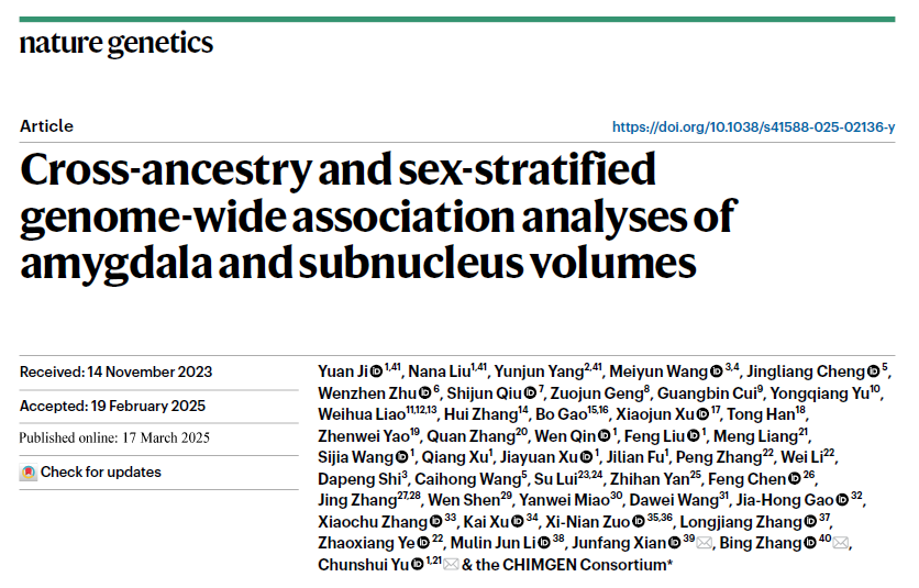 2025年3月17日,Nature Genetics在线发表了娱乐平台-十大博彩娱乐平台 张冰教授,首都医科大学附属北京同仁医院鲜军舫教授,和天津医科大学总医院于春水教授团队合作的研究论文,题为“Cross-ancestry and sex-stratified genome-wide association analyses of amygdala and subnucleus volumes”。该研究首次系统性解析了杏仁核及其亚核体积的跨祖先、跨性别遗传异质性,为杏仁核相关神经-精神疾病的精准诊疗提供了新见解。