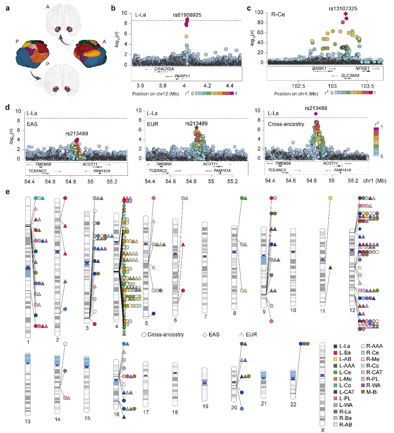 娱乐平台-十大博彩娱乐平台 附属鼓楼医院张冰教授团队与天津医科大学总医院于春水教授团队等国内外多家机构合作,采用跨祖先荟萃分析(Trans-ancestry meta-analysis)与性别分层全基因组关联分析策略,基于东亚(6,923例)与欧洲(48,634例)两大祖先群体共55,557名参与者的遗传与神经影像数据,系统解析了双侧杏仁核整体及其9个亚核体积的遗传调控特征(图1)。该策略显著提升了复杂性状遗传关联的发现效力,为开发基于性别与种族分层的精准诊疗奠定了理论基石。