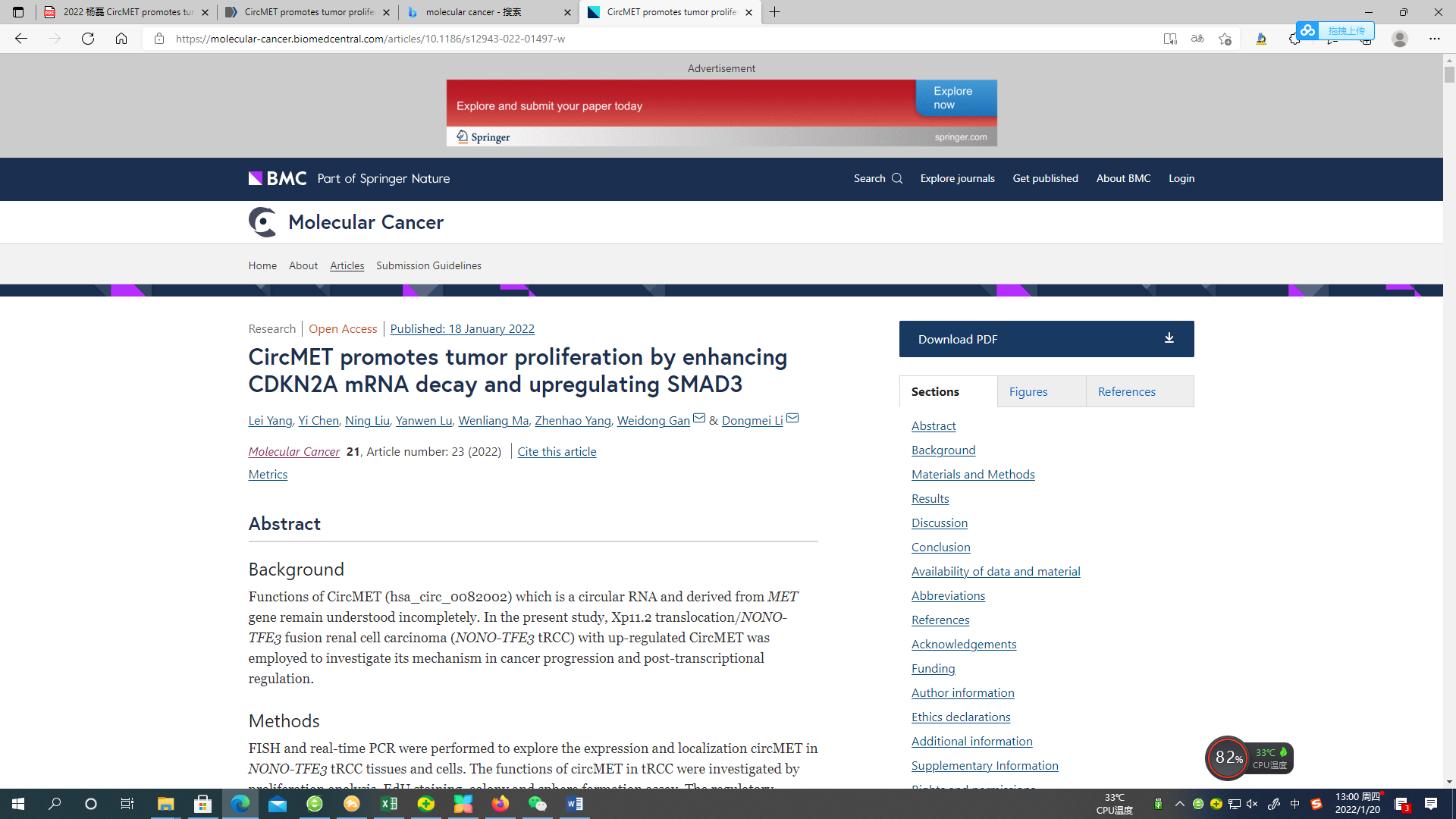 2022年1月18日,娱乐平台-十大博彩娱乐平台 李冬梅/甘卫东团队在Molecular Cancer杂志上发表文章《CircMET promotes tumor proliferation by enhancing CDKN2A mRNA decay and upregulating SMAD3》,通过利用新兴分子生物学技术详细阐述了circMET在肿瘤中调控细胞增殖的功能及机制。
