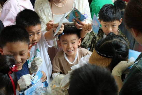 孩子们化身小小动物研究员兴奋地围着小动物,近距离地观察显微镜下的果蝇和刚刚出生的斑马鱼,在志愿者的帮助下摸一摸活泼好动的小鼠。打卡盖章环节更提升了本次活动的趣味性,小朋友们通过在每个展台听取实验动物知识讲解集章,然后兑换伴手礼斑马鱼,极大激发了孩子们参加活动的热情。