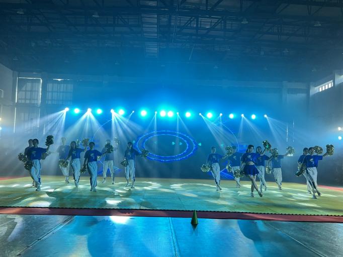 本次大赛由南京大学体育部主办,党委学工部、研工部、团委协办,共有来自29个院系的27支队伍参赛。我院参赛队伍在第15位出场。蔚蓝的运动服,闪耀的金花球,熟练有力的动作姿态,游刃有余的队形变换,参赛队员一出场,便获得了全场的关注。大家默契配合,将那份不同寻常的激动和紧张化为了炫目灯光下的完美动作和舞台张力。