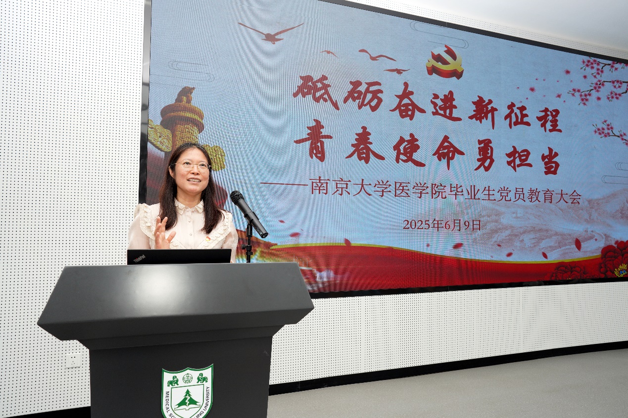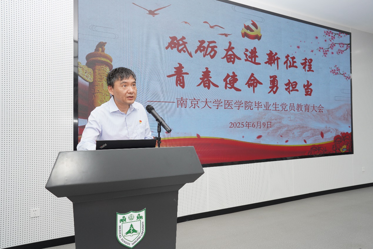 沈苏南代表娱乐平台 党委勉励同学们牢记“三重身份”赋予的使命。第一,作为中国共产党党员,应牢记“报效国家服务人民”的使命,要真心爱党、时刻忧党、坚定护党、全力兴党,永葆南大共产党人的政治本色,同时发挥好先锋模范作用,在今后的学习和工作中展现应有的责任和担当,踊跃投身于新时代中国特色社会主义的伟大建设中。第二,作为医学工作者,要牢记“健康所系性命相托”的誓言。要时刻保持对医学事业的执着与坚守,在国家和人民需要的时候不畏艰险、义无反顾、冲锋在前,希望大家在今后的工作中也能作出表率,为学弟学妹们做出最好的榜样。第三,作为南京大学的校友,要牢记“诚朴雄伟,励学敦行”的校训,践行“心系‘国家事’,肩扛‘国家责’”的报国使命,以南大人特有的社会责任感和使命感投身改革创新的时代大潮。同时,他也表达了对毕业生们的美好祝愿,并希望大家能一直心系母校、娱乐平台 的发展,常回家看看,为学校娱乐平台 的发展建言献策,为建设“第一个南大”贡献力量。