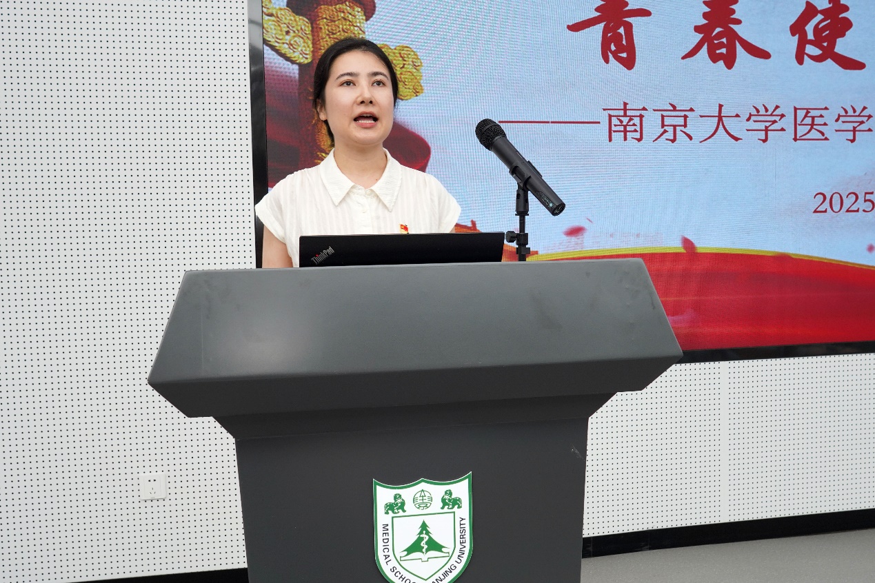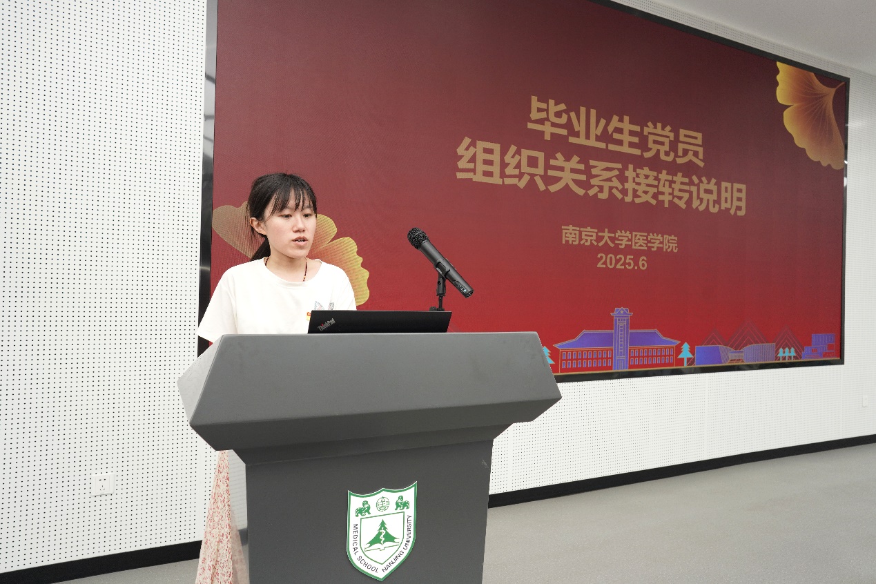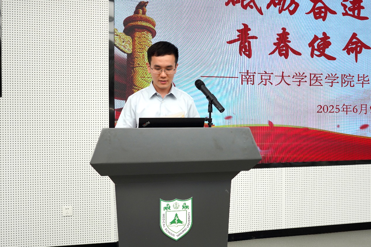 临床医学长学制博士第一党支部的赵子赫回顾了在南京大学长达9年的学习时光,他表示,身为新时代的医学生党员,应始终坚定拥护“两个确立”、坚决做到“两个维护”,将忠诚融入血脉,将信仰铸入灵魂。虽然现在他们将离开承载着深厚情感的母校,奔赴不同的工作岗位。但无论未来身处何地,他们都将牢记党的根本宗旨,全心全意为人民健康服务,恪守崇高医德,精益求精提升医术,把医者的价值融入实现中华民族伟大复兴的事业中,不辜负党和人民的培养与重托,为祖国的卫生健康事业贡献自己的力量。
