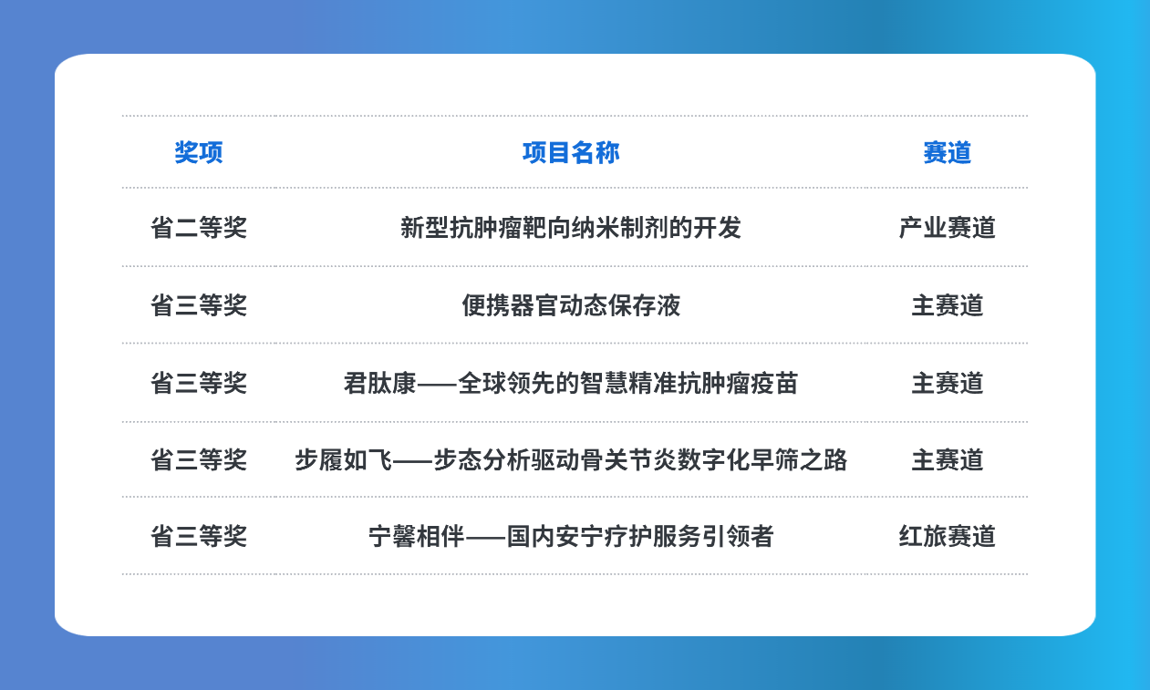 在本赛季中,十大博彩娱乐平台 积极组织动员、指导学生参加,通过校赛选拔,娱乐平台 共有5支参赛队伍在本次省赛中获奖,是历届参加省赛项目最多的一次。野庆松团队“新型抗肿瘤靶向纳米制剂的开发”获产业赛道二等奖;郑德源团队“便携器官动态保存液”获主赛道三等奖;朱军梦团队“君肽康——全球领先的智慧精准抗肿瘤疫苗”获主赛道三等奖;王腾宇团队“步履如飞——步态分析驱动骨关节炎数字化早筛之路”获主赛道三等奖;孙露露团队“宁馨相伴——国内安宁疗护服务引领者”获红旅赛道三等奖。