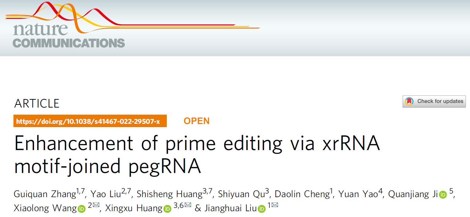 20220406日,这篇题为“Enhancement of prime editing via xrRNA motif-joined pegRNA”的论文发表于《自然-通讯》杂志(Nature Communications)。该工作的第一作者(共同)为十大博彩娱乐平台 模式所博士生张贵泉、刘尧(西北农林科技大学)和黄诗圣(上海科技大学);通讯作者分别为刘江怀、黄行许(上科大)与王小龙(西农)教授。研究工作受到科技部重点研发计划等项目的资助。