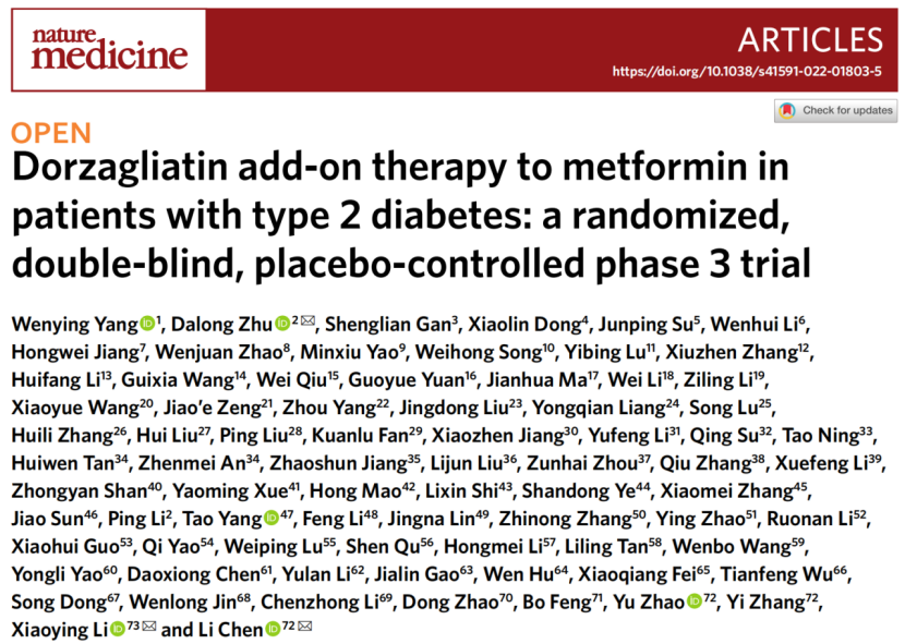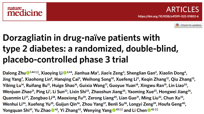 2022年5月12日,娱乐平台-十大博彩娱乐平台 附属鼓楼医院朱大龙教授团队在Nature Medicine杂志同时在线发表了两篇论文:“Dorzagliatin in drug-naïve patients with type 2 diabetes: a randomized, double-blind, placebo-controlled phase 3 trial”和“Dorzagliatin add-on therapy to metformin in patients with type 2 diabetes: a randomized, double-blind, placebo-controlled phase 3 trial”。文章报道了全球首创糖尿病新药葡萄糖激酶激活剂(GKA)多格列艾汀(dorzagliatin)的III期注册临床研究结果。两篇论文分别详细展示和描述了多格列艾汀单药(SEED研究)用于治疗新诊断未用药2型糖尿病患者,以及多格列艾汀联合二甲双胍(DAWN研究)用于治疗二甲双胍足量治疗失效2型糖尿病患者的临床疗效和安全特征。