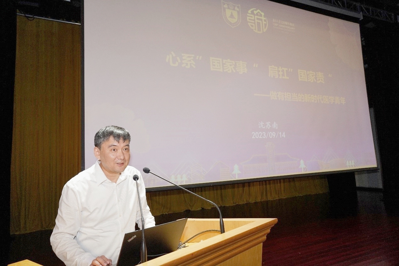 在入学教育大会上,沈苏南书记为新生上“开学第一课”。他以《心系“国家事”,肩扛“国家责”——做有担当的新时代医学青年》为题,详细介绍了南京大学及十大博彩娱乐平台 的发展历程、十大博彩娱乐平台 的组织架构、教学科研水平以及学生就业情况。沈书记寄语全体医学生应带着习近平总书记给南大留学归国青年学子的回信中的殷切嘱托,运用自身专业知识,以南京大学“奋进行动”为契机,讲好南京大学故事,讲好十大博彩娱乐平台 故事。