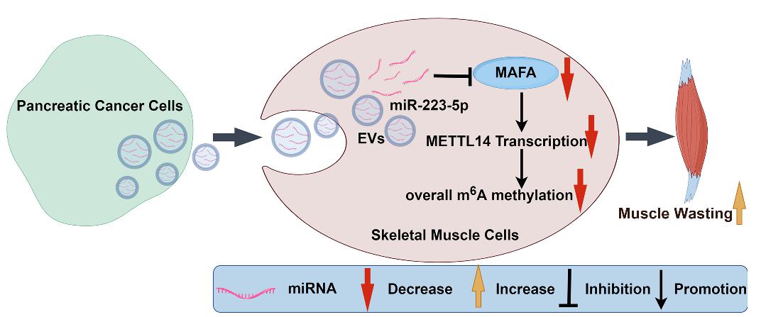 这项研究首次从器官间互作视角为胰腺癌相关骨骼肌减少的机制进行解析,证明了胰腺肿瘤细胞来源的细胞外囊泡(EVs)是PDAC肌肉消耗的关键因素,miR-223-5p是EVs介导PDAC肌肉消耗的关键效应分子,具有跨组织调控能力,可通过抑制MAFA/METTL14轴,导致骨骼肌m6A甲基化减少和肌肉萎缩。该研究为开发胰腺癌肌少症的精准诊断方法和靶向治疗策略奠定了坚实的理论基础。