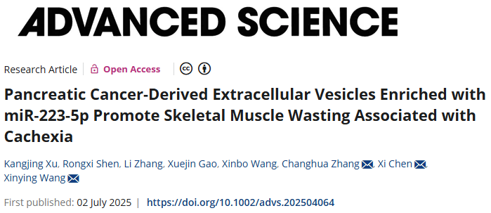 2025年7月2日,娱乐平台-十大博彩娱乐平台 附属金陵医院王新颖教授团队、南京大学生命科娱乐平台 陈熹教授团队和中山大学附属第七医院张常华教授团队合作,在《Advanced Science》在线发表了题为“Pancreatic Cancer-Derived Extracellular Vesicles Enriched with miR-223-5p Promote Skeletal Muscle Wasting Associated with Cachexia”的研究成果。这项研究首次揭示胰腺肿瘤细胞通过释放细胞外囊泡实现与骨骼肌的远程通讯,驱动PDAC患者肌肉消耗;并发现循环EVs中的miR-223-5p是该过程的关键效应分子和潜在诊断标志物,为开发胰腺癌肌少症的精准诊断方法和靶向治疗策略奠定了坚实的理论基础。娱乐平台-十大博彩娱乐平台 博士研究生徐康菁为本文的第一作者。娱乐平台-十大博彩娱乐平台 附属金陵医院王新颖教授为本文的最后通讯作者。该项研究得到了国家自然科学基金委、科技部、江苏省科技厅以及中央高校等基金的支持,并在相关研究方面得到合作实验室的大力协助与支持。