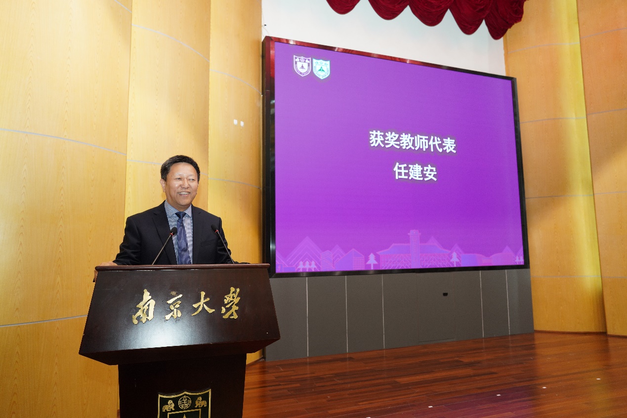 获奖教师代表任建安发言。任建安老师指出,作为教师要帮助学生实现两个方面的转变,一是在学习上实现从过去的背题到现在的研究性学习模式的转变,二是在身份上实现从普通民众到神圣医生的转变。“向高处立、就平处坐、从宽处行”,努力培育杰出的医学人才。