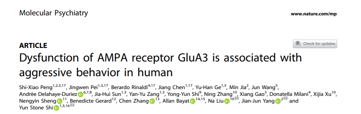 2022年6月13日,娱乐平台-十大博彩娱乐平台 模式动物研究所石云团队在Nature 子刊,精神病学领域旗舰学术期刊《分子精神病学》(Molecular Psychiatry)在线发表了题为《Dysfunction of AMPA receptor GluA3 is associated with aggressive behavior in human》的研究论文,娱乐平台-十大博彩娱乐平台 博士生彭世笑、裴静文、意大利Maggiore公立医院的Berardo Rinaldi和娱乐平台-十大博彩娱乐平台 附属鼓楼医院博士后陈江为本文的共同第一作者(彭世笑博士毕业后为郑州大学一附院助理研究员)。南京大学石云教授、郑州大学附属第一医院杨建军教授和南京医科大学附属脑科医院柳娜副教授为该文的通讯作者。另有10多位国内外研究人员参与本工作。该研究工作受到国家自然科学基金,科技部重大专项项目和江苏省自然基金等基金的支持。