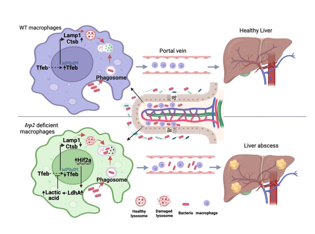 南京大学十大博彩娱乐平台 李宽钰教授课题组和附属鼓楼医院病理科樊智文副研究员合作,利用葡聚糖硫酸钠盐(DSS)造肠炎模型后,意外发现Irp2缺失小鼠有肝脓肿表型。为了探究IRP2在保护机体免受肠源性感染造成肝脓肿中的作用及其机制,研究人员首先给予Irp2全身敲除和髓系细胞Irp2敲除小鼠间隔DSS饮水构建肠道屏障损伤后,发现Irp2缺失后不影响中性粒细胞载菌量变化,只增加巨噬细胞载菌量,同时发现Irp2缺失并不影响巨噬细胞的吞噬功能和溶酶体递送功能,但显著影响溶酶体的生物合成和酸化能力。进一步机制研究发现Irp2缺失上调Hif2a表达,引起乳酸脱氢酶的活性和乳酸水平增加,促进转录因子TFEB的磷酸化,导致TFEB不能正常入核,溶酶体生物合成减少,酸化能力下降,降低了巨噬细胞清除细菌的能力。因此,Irp2缺失后,病原菌有机会从受损的肠屏障进入门静脉,不断侵袭和易位进入肝脏,促进肝脓肿的发生发展。