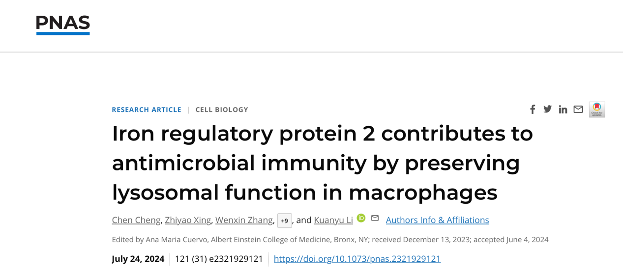 2024年7月24日,李宽钰课题组在PNAS杂志发表了题为“Iron regulatory protein 2 contributes to antimicrobial immunity by preserving lysosomal function in macrophages”的研究论文。该研究开拓了IRP2的功能,阐明了IRP2对免疫细胞功能的影响,为临床治疗肠源性肝脓肿提供新的靶点。娱乐平台-十大博彩娱乐平台 李宽钰教授和十大博彩娱乐平台 附属鼓楼医院樊智文副研究员为论文通讯作者,十大博彩娱乐平台 博士生程晨为本文的第一作者。本研究得到了以色列理工大学Esther Meyron-Holtz教授,墨西哥Cinvestav的Fanis Missirlis教授的帮助;得到了娱乐平台-十大博彩娱乐平台 附属金陵医院普外科的李毅教授、附属鼓楼医院血管外科的乔彤教授和河北师范大学常彦忠教授等的大力帮助;得到了国家自然科学基金(#32271221, #82170592)的资助。