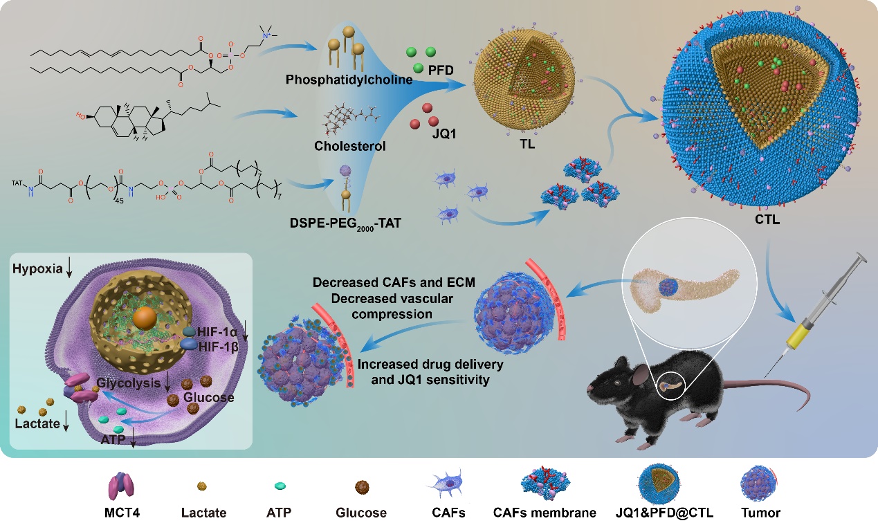 综上针对CAFs在胰腺癌中的作用机制,研究人员设计了一种主动靶向富含CAFs的胰腺癌的特洛伊木马系统,通过PFD减少肿瘤微环境中细胞外基质的产生,进一步暴露胰腺肿瘤,增加后续的药物灌注。并且PFD通过调节CAFsBRD4的影响增强了癌细胞对JQ1的敏感性。转录组测序表明PFD治疗改善了肿瘤组织的缺氧环境,并下调了糖酵解的关键酶和产物,导致肿瘤的能量代谢障碍。本研究中提出的策略将抗纤维化药物和化疗药物整合在纳米载体中,通过增强药物渗透和提高化疗疗效,作为一种有前途的药物递送机制来增强耐药肿瘤的治疗。