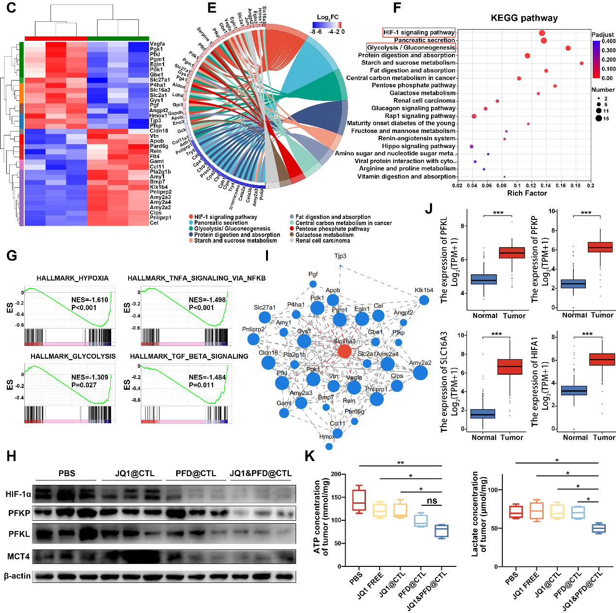 研究人员为了阐明PFD对胰腺癌的抗癌作用机制,对JQ1&PFD@CTLJQ1@CTL治疗组的肿瘤组织进行了转录组测序。KEGG富集分析研究差异表达基因,发现其主要富集在HIF-1信号通路和糖酵解信号通路,并且观察到在JQ1&PFD@CTL治疗组糖酵解关键酶的下降和乳酸及ATP水平的降低,表明肿瘤组织主要的能量代谢途径被抑制。