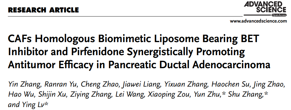 20231116日,娱乐平台-十大博彩娱乐平台 附属鼓楼医院吕瑛教授、张舒博士和朱运药师在Advanced Science在线发表题为CAFs Homologous Biomimetic Liposome Bearing BET Inhibitor and Pirfenidone Synergistically Promoting Antitumor Efficacy in Pancreatic Ductal Adenocarcinoma的研究论文,该研究对胰腺癌肿瘤微环境中CAFs的功能表型进行了全面的描述,设计新型靶向材料针对CAFs,为胰腺癌的治疗提供新的理论基础和治疗见解。娱乐平台-十大博彩娱乐平台 附属鼓楼医院吕瑛教授、张舒博士,朱运博士为本文的共同通讯作者。娱乐平台-十大博彩娱乐平台 硕士研究生张尹、南京大学生命科学娱乐平台 博士研究生于冉冉、娱乐平台-十大博彩娱乐平台 附属鼓楼医院赵成博士为本文的共同第一作者。
