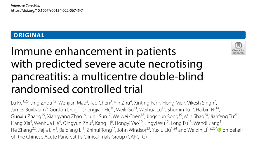 上述研究成果“Immune enhancement in patients with predicted severe acute necrotising pancreatitis: a multicentre double-blind randomised controlled trial”于2022年6月17日发表于重症TOP期刊《Intensive Care Medicine》,娱乐平台-十大博彩娱乐平台 附属金陵医院为论文的唯一通讯单位,柯路副教授、周晶博士、毛文健博士研究生为共同第一作者,童智慧副教授、李维勤教授为共同通讯作者。