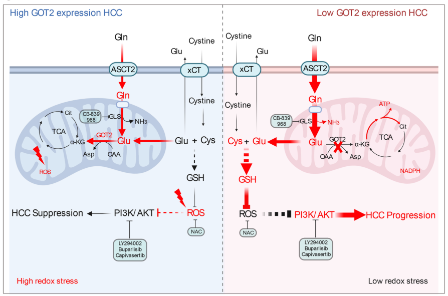 谷氨酸草酰乙酸转氨酶2(GOT2)参与谷氨酰胺代谢,介导谷氨酸和草酰乙酸转化为α-酮戊二酸和天冬氨酸。GOT2在正常肝脏组织中特异性高表达,但是随着HCC的恶性进展,GOT2的表达逐渐下调。娱乐平台-十大博彩娱乐平台 附属鼓楼医院余德才教授课题组在多个公共数据库及临床样本中明确,GOT2在HCC肿瘤组织中下调,并且与患者不良预后相关。体内外实验证实,GOT2 knockdown 促进了HCC细胞的增殖迁移、肝内及血行转移。通过13C5,15N2-谷氨酰胺同位素代谢流等实验发现,HCC中GOT2的降低,介导了谷氨酰胺代谢重编程,转向合成还原性谷胱甘肽(GSH),通过抵抗HCC进展中活性氧(ROS)损伤,维持肿瘤细胞氧化还原稳态,激活PI3K/AKT/mTOR信号通路从而促进了HCC的恶性进展。与此同时,GOT2沉默增强了HCC谷氨酰胺依赖及谷氨酰胺酶抑制剂(CB-839)的敏感性,通过体内外实验及LIMOR数据库证实GOT2沉默促进了HCC的CB-839治疗反应性。因此,GOT2有望成为HCC诊断和治疗的新靶点。