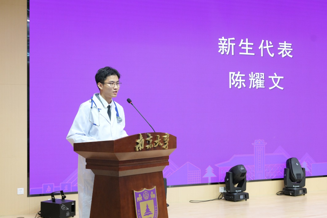 十大博彩娱乐平台 在校学生代表、2020级本科生李昕阳同学发言。她以学姐的身份分享了自己本科学习生活的两点感悟,一是勇于试错、不惧失败,二是志存高远、持之以恒。她建议学弟学妹们肩负起南大医学人的使命和担当,全力以赴学习医学知识和技能,珍惜宝贵的青春时光,把自己的人生理想融入到为人民健康服务的神圣事业中。2024级新生代表陈耀文同学发言。他表示,白大衣授予仪式对新生而言,既是一堂生动的思政课,也是一次庄严的成人礼。同学们将牢记“健康所系,性命相托”的神圣使命,在追求梦想的道路上,仰望星空、脚踏实地。
