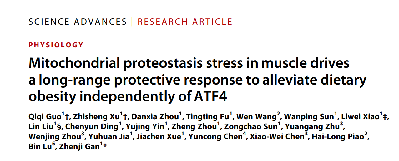 On July 27, 2022, Professor Zhenji Gan’s team at the Model Animal Research Center of Nanjing University published a groundbreaking study titled “Mitochondrial proteostasis stress in muscle drives a long-range protective response to alleviate dietary obesity independently of ATF4” in Science Advances. The research revealed a novel mechanism through which the unfolded protein response (UPRmt) in skeletal muscle mitochondria regulates systemic metabolism. The co-first authors of the paper are Qiqi Guo and Zhisheng Xu, doctoral students from Nanjing University, with Professor Zhenji Gan as the corresponding author.