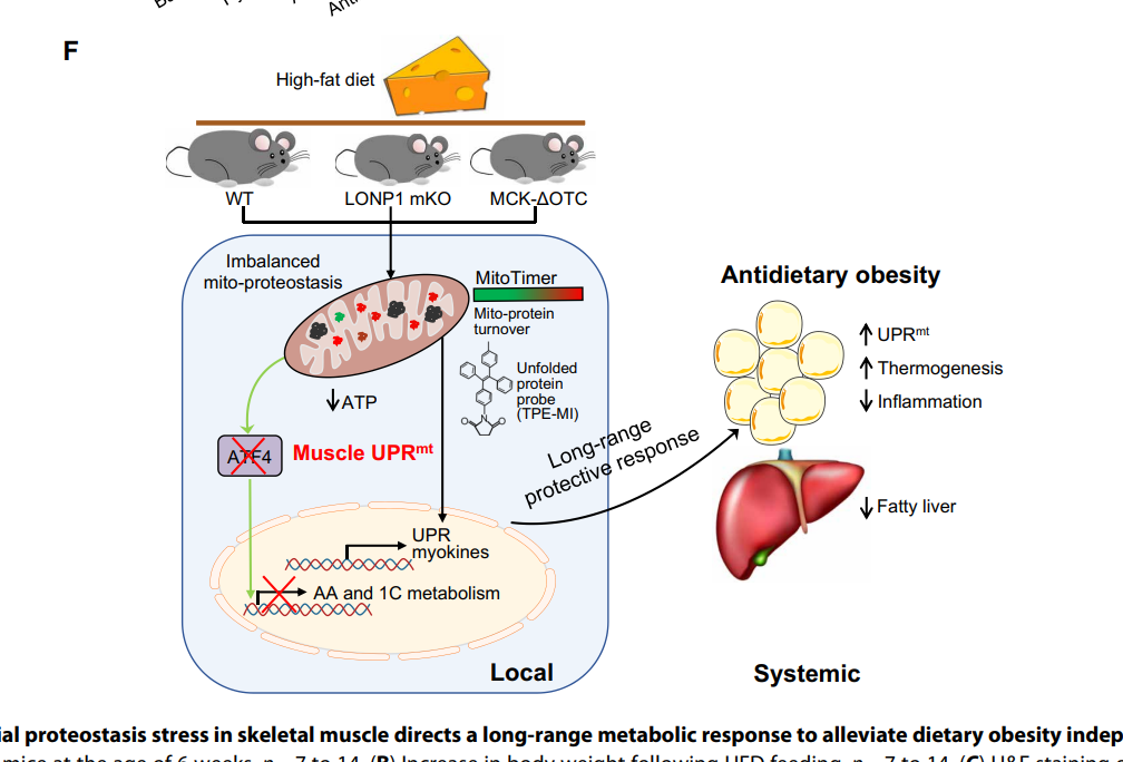 This study discovered that LONP1 links mitochondrial protein quality control to muscle mitochondrial proteostasis stress, which alleviates dietary obesity (Figure 1). Using two independent skeletal muscle-specific transgenic and knockout mouse lines, the team provided robust in vivo data demonstrating that LONP1-dependent mitochondrial protein quality control is crucial for safeguarding muscle mitochondrial proteostasis and preserving systemic metabolic homeostasis during high-fat diet metabolic stress. They also discovered that mitochondrial proteostasis imbalance elicits an UPRmt in muscle, which acts distally to regulate the response of the adipose tissue and liver to high-fat diet. Additionally, the researchers clearly demonstrated that muscle UPRmt acts independently of ATF4 to drive a long-range protective response, emphasizing the existence of an ATF4-independent UPRmt in mammals. Thus, they discovered a novel muscle UPRmt that drives a long-range protective response to alleviate dietary obesity.